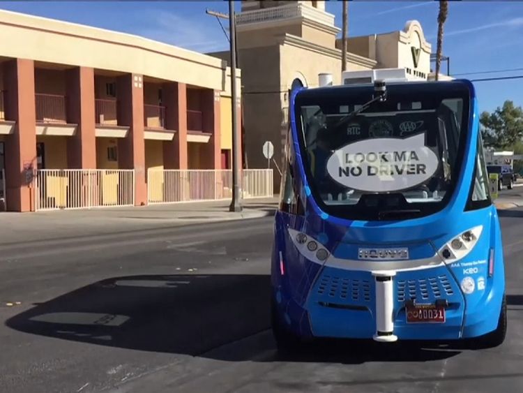 Image:The driverless bus smoothly rolls into a parking space in Las Vegas