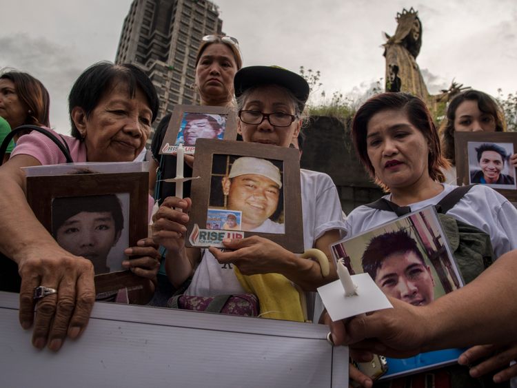 Image:Demonstrators in Manila hold pictures of family members killed in the war on drugs